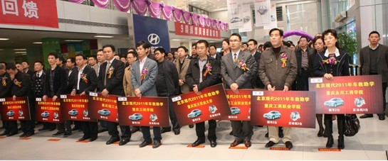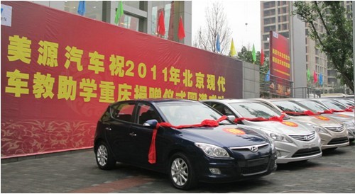 10月31日,北京现代2011年“车教助学”重庆地区院校捐赠仪式在重庆市北京现代重庆美源店隆重举行,重庆市人民政府副市长吴刚,市教委主任、市委教育工委副书记周旭,北京汽车股份有限公司副总裁毛海,北京现代汽车有限公司副总经理谢伟,重庆美源汽车发展有限公司董事长彭芳出席了捐赠仪式。