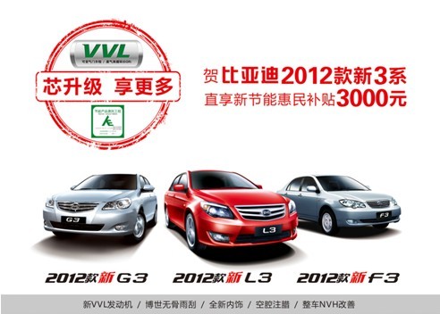 10月31日,比亚迪2012款新3系车型正式“换芯”上市,新3系包括F3、G3、L3三款热销A级车,其中有“三冠王”美誉的比亚迪“功勋车”F3改变最大、提升最多,可谓本次推新的“带头大哥”。目前新3系车型各地均已到店开始销售,引发了消费者强烈关注。据了解,比亚迪在2012款新3系车型上做了全面提升,配置升级达29项之多,品质也是此次提升的重点。而最大的亮点无疑是新3系更换了拥有VVL(可变气门升程)技术的BYD473QE发动机,并且全系已进入最新节能惠民目录,继续享受3000元补贴,新发动机的节能技术得到国家认可。