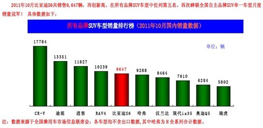 S6于今年5月份上市以来,凭借出色的产品性能、丰富的电子配置和时尚的外观获得了消费者追捧。不到半年时间,累计销量就达到了32890辆,10月份的销量超过了9600辆,蝉联自主SUV冠军。已经说明S6在中国SUV市场站稳脚了跟。