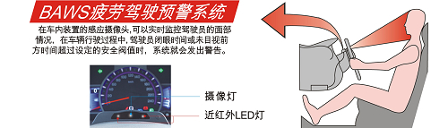 比亚迪G6搭载的 “BAWS智能疲劳式驾驶预警系统”由ECU和摄像头两大模块组成,通过灵敏的感应装置对驾驶员的面部特征、眼部信号、头部运动性等进行采集分析,以推断驾驶员的疲劳状态,对疲劳驾驶情况进行及时报警提示。该系统还具备对环境的强抗干扰能力,对车主行车安全给予主动智能的安全保障,实现“全天候实时监测;人工智能识别;多媒体语音报警;疲劳等级自动调整”四大功能。