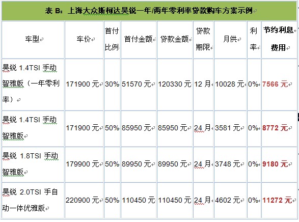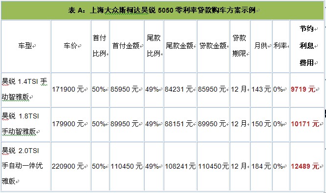 斯柯达昊锐此次推出的金融大礼,在很大程度上减轻了消费者的还款与利息支出压力,而且还为贷款购车用户提供了五种不同的超值贷款购车方案选择,全系车型均可自由选择5050零利率、一年零利率、两年零利率、两年低利率、三年低利率五种贷款购车方案,实惠省钱而且快捷方便。在表A的昊锐5050零利率贷款购车方案中,以消费者购买昊锐1.4TSI手动智雅版车型为例,首付50%只需8.595万元,最低月供低至143元,累计节省利息支出9719元;而在此方案中,购买昊锐1.8TSI手动智雅版的消费者则能够节省利息支出10711元;购买昊锐2.0TSI 手自动一体优雅版车型的消费者可节省利息费用12489元。昊锐5050零利率贷款购车方案为解决部分购车者短期内的资金紧张提供了超值的选择。