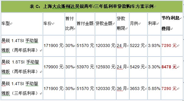 对于部分资金更为紧张,需要较长时间周转资金的消费者来说,还可选择两年或三年低利率贷款购车方案,首付低至30%,月供压力也更小,财务安排更加自由,而且与央行6.65%的中长期个人消费贷款利率相比,利率更低,大大节省了利息支出。表C中以购买售价17.99万元的昊锐 1.8TSI 手动智雅版为例,首付仅需5.397万元,月供也只有3799元,利率也仅为5.44%,节省利息支出8478元。