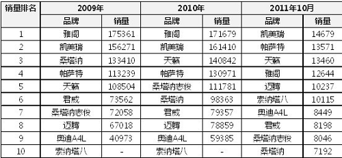 2011年10月中高级车销量排行(资料来源:易车网)