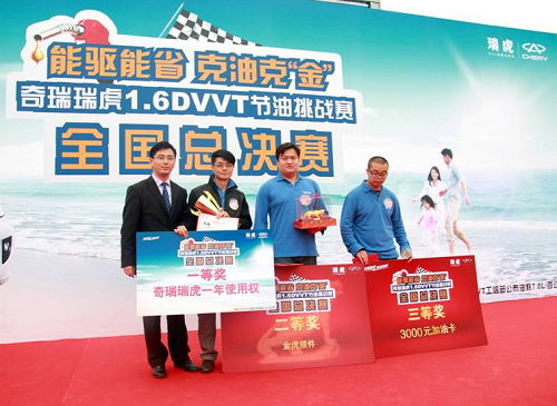 在经历4个小时四轮的艰苦角逐,最终所有参赛车辆在总长30公里的比赛路段上顺利返回,经过现场称重及公正人员的严格检验后,来自河北沧州地的苗峰先生,以百公里4.1755L的破纪录油耗夺得总决赛冠军。为瑞虎节油挑战赛胜利收官画上了圆满的句号。