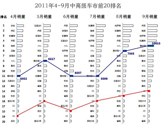 市场披露的数据表明,2011年的中国车市告别高增长,整体温度趋凉,但中高级车市却呈现高温态势。高温不仅体现在中高级车销量增长高于整体车市,更主要是来自于各大车企在这里的厮杀。