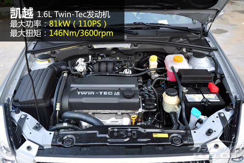 凯越配备了来自通用的全球动力总成供应商澳洲霍顿提供的发动机,如今销售的仅为1.6L版本。这台Twin-Tec的直列四缸发动机中规中矩,好处是已经相当成熟和便于维护。最大81kW的功率,对于应付1.2-1.3吨重的车身并不会显得很费力,而最重要的是重新调校过的发动机,在油耗上会有更好的表现。