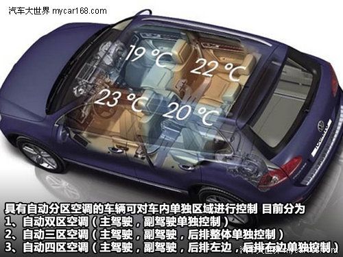 分区空调通过装载在车上的每个温控区域的温度传感器来检测这个区域的温度,当温度与人想要的温度存在差异,传感器会发出指令,命令自动空调电脑控制单独出风口的出气温度。从而达到单独区域专享温度的效果。