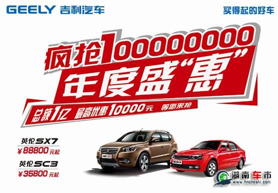 现吉利汽车正推出“疯抢1亿,年度盛惠”活动,1亿让利,空降北方四省,抢完即止。即日起,来英伦4S店,购英伦品牌单一车型最高优惠10000元,英伦SX7惠后价最低仅为88800元,SC3仅35800起价,优惠幅度,史无前例。联系电话:13548660396