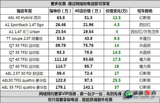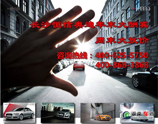 长沙奥迪部分车型限时限量销售,全年最给力的价格就等你来,最低一口价,绝对有诚意,买台奥迪回家过春节吧!不要让机会流失!这是一个绝对超值的机会,尊贵的奥迪将带给您无尽的享受!此活动为网络客户尊享,指定车型尊享特价,限量销售,特价车资源以您到店确认为准,如果您看准了请及时拨打我们的热线与店内销售顾问确认好资源,卖一台少一台,先到先得,机会不容错过!
