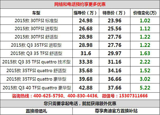 【湖南车市讯】长沙奥迪Q3现车销售,最高优惠52200元,现车销售,资源以到店为准!长沙恒信奥迪十一月特惠购车盛宴已经开启,奏响长沙车市最强音。让优惠一降到底吧!通过网络或电话购车享更多优惠,企业购车、公务员购车享更多优惠,活动详情请咨询店内销售人员,咨询热线:400-625-5750、400-830-4436,优惠详情: