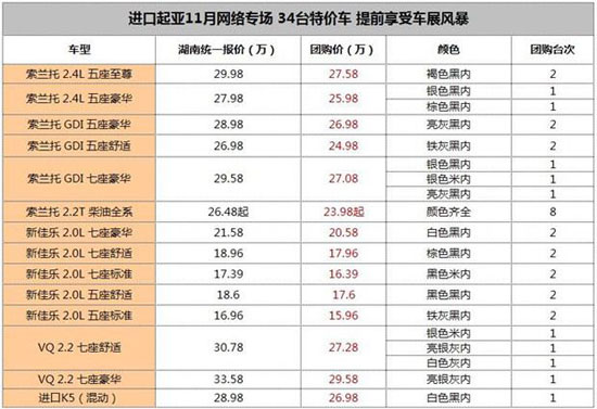 【湖南车市讯】日前,编辑从湖南韩通进口起亚旗舰店了解到,11月22-23号,湖南河西韩通4S店内将有34台特价车,电话预约更有3000元精品相送,敬请详询:0731-8833 6212 或 8833 6207。活动车辆及价格详见下表: