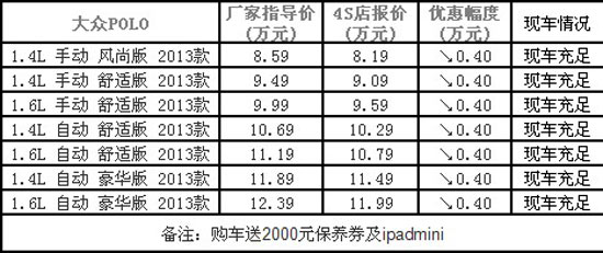 【湖南车市讯】近日湖南车市编辑从上海大众兰天众天4S店处了解到,上海大众POLO优惠4000元,购车送2000元保养券及iapd mini。具体优惠详情如下: