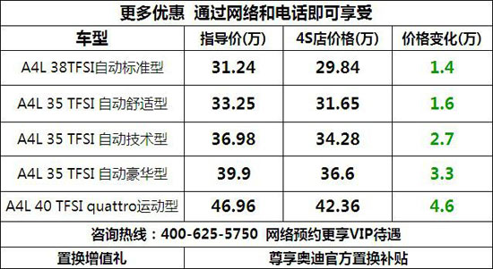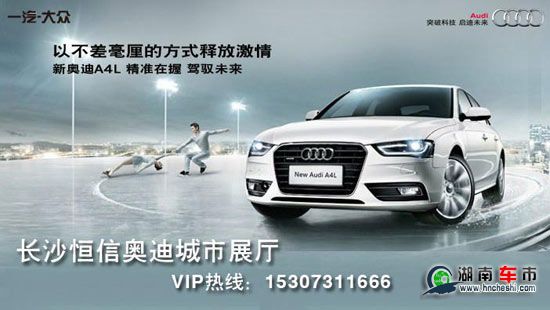 【湖南车市讯】奥迪城市展厅店内优惠活动火热升级,长沙奥迪A4L限时特惠,其中高配车型最高优惠可达46000元。长沙恒信奥迪还推出了多种金融政策,您还可以参加长沙恒信奥迪特别推出的“品荐二手车”活动, 置换成功更可享置换大礼包!更多优惠尽在长沙恒信奥迪城市展厅,通过网络和电话咨询优惠更多,咨询热线:400-625-5750或者400-868-3868