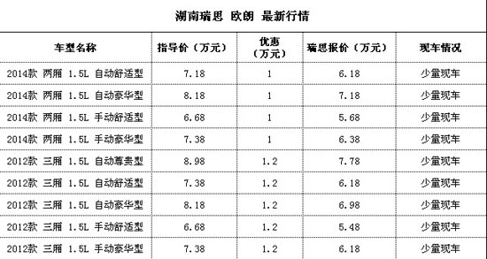 【湖南车市讯】近日,编辑从湖南瑞思奔腾店获悉,欧朗有现车销售,最高优惠1.2万元,感兴趣的朋友可以致电或到店详询,具体优惠如下: