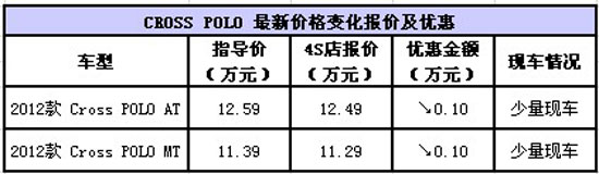 【湖南车市讯】近日湖南车市编辑从上海大众兰天众天4S店处了解到,上海大众Cross Polo优惠1000元,购车送3000元保养券。具体优惠详情如下: