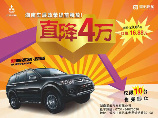 【湖南车市讯】广汽三菱全国冠军店——湖南星宏店五月车展政策提前享,各车型均有不同程度优惠,其中,优惠力度最大的是新帕杰罗劲畅,直降4万!即指导价20.88万的2.4L舒适版车型价格下探到16.88万!!一款长近4.7米,轴距2.8米的中大型SUV仅需16.88万元,这种政策可谓史无前例。湖南星宏现现有10辆现车享受此政策,售完即止。喜欢越野车的朋友千万不要错过!购车热线:0731-84073030。
