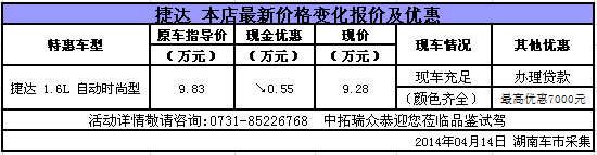 【湖南车市讯】湖南中拓瑞众店内捷达现车销售,颜色可选,目前购捷达1.6自动时尚型综合优惠12500元(现金优惠0.55万元,同时办理贷款最高可享7000元优惠)展厅多款车型钜惠同步进行中。感兴趣的朋友可以拨打24小时销售热线136-8735-1177或0731-85226768咨询,具体优惠信息如下: