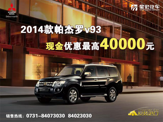 【湖南车市讯】近日,编辑从湖南星宏三菱4S店了解到,该店2014款帕杰罗V93现在购车可最高优惠现金4万元!