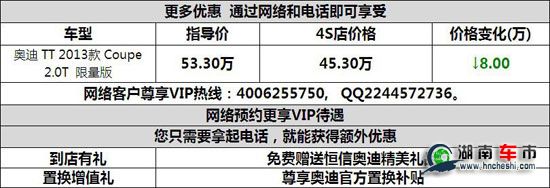 【湖南车市讯】奥迪TT,让时尚,愉悦你。长沙奥迪恒信城市展厅奥迪TT部分车型钜惠80000元,限量销售,车源以到店为准。我们将为您提供优质的金融服务,还推出了“品荐二手车”的活动。详细优惠请咨询:400-625-5750或者400-868-3868