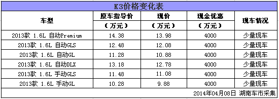【湖南车市讯】湖南合顺4S店四月钜惠来袭,店内K3现车销售,颜色可选,目前购车部分车型可享最高优惠0.4万元,另外送4000元装饰大礼包,欢迎广大客户来店或红星车展选购您的爱车,心动不如行动!感兴趣的朋友可以到店咨询购买,详情见下表: