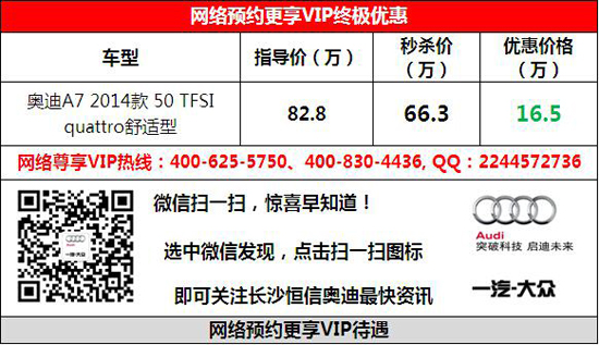 【湖南车市讯】长沙奥迪A7现车销售,市场指导价828000,现在最高优惠165000元,秒杀价663000元。限量一台,车源以到店为准。长沙恒信奥迪金融特供季有“0”月供、18期“0”利率、2成低首付、18期超长贴息等多种金融政策,还特别推出的“品荐二手车”活动,置换成功更可享置换大礼包!更多优惠尽在长沙恒信奥迪城市展厅,通过网络和电话咨询优惠更多,咨询热线:400-625-5750、400-830-4436
