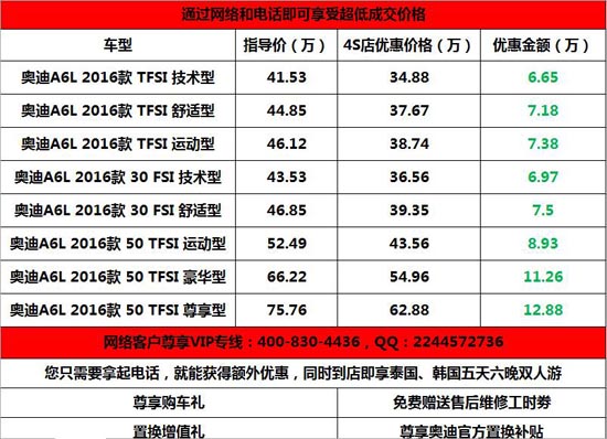 长沙恒信奥迪感恩钜馈——盛夏钜惠,湖南省底价来袭,奥迪A6直降128800元。长沙奥迪带给您不一样的购车惊喜,恭迎到店品鉴!长沙恒信奥迪金融季为您推出了指定车型18期超长贴息、2成低首付等金融方案,我们还有“品荐二手车”活动,置换成功更可享置换大礼包! 更多优惠尽在长沙恒信奥迪,订车即享巴厘岛五天四晚豪华双人游,VIP咨询热线:400-830-4436: