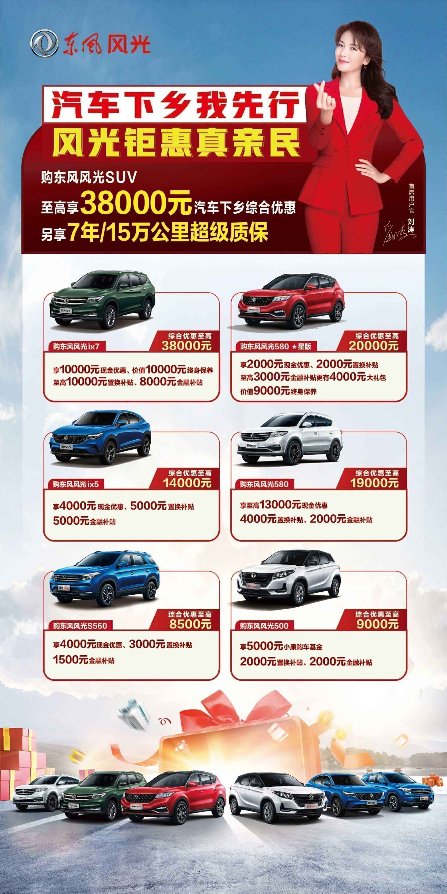 除2款新车型外,全域中型SUV风光ix7、智能轿跑新SUV风光ix5、年轻人的SUV风光S560、超级都市SUV风光580等现有SUV车型也纷纷参与此次汽车下乡综合优惠活动,为不同需求的用户提供了更多选择。