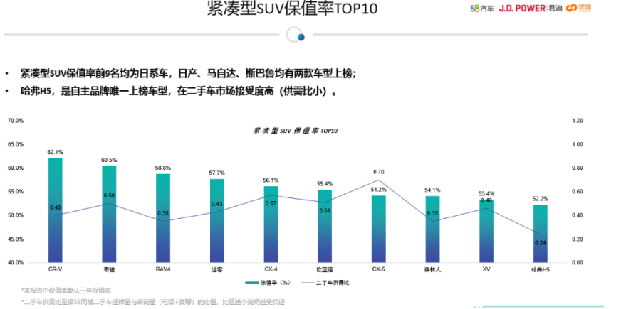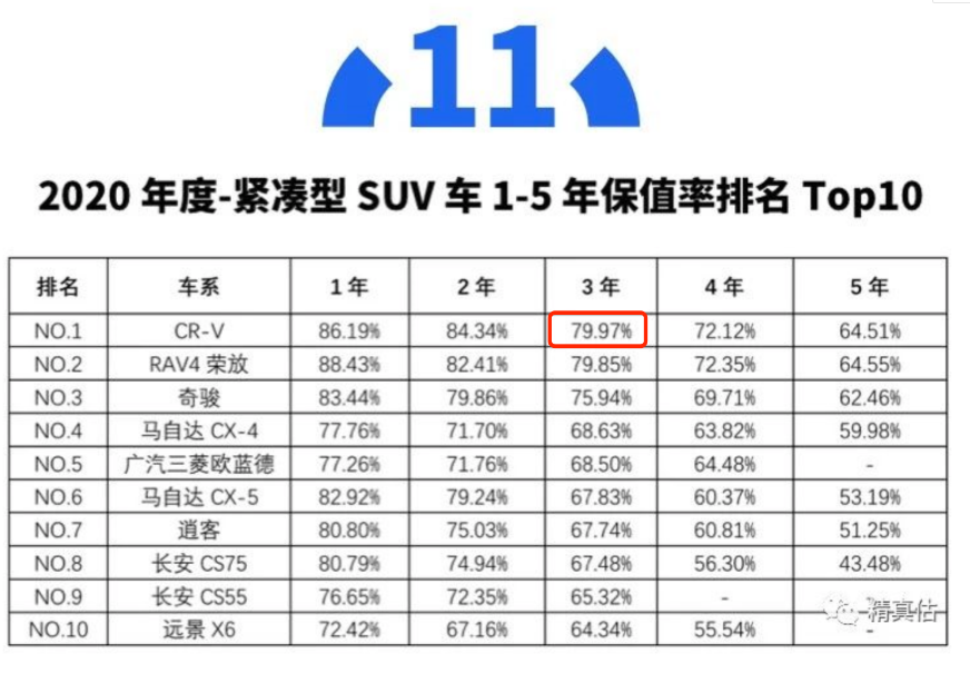 随后,CR-V像开了挂一样,冲进了国内的诸多SUV保值率榜单前三,尤其是五年保值率更是霸榜各年份的第一位置。今年1月份,中国汽车流通协会发布的“2020年度中国汽车保值率报告”中,CR-V又以三年保值率79.97%的成绩拿下2020年度紧凑型车1-5年保值率第一名;在今年10月 58汽车联合J.D.Power颁布的“紫檀奖·2021中国汽车保值率风云榜”中,CR-V以62.9%的成绩荣获紧凑型SUV保值率第一。