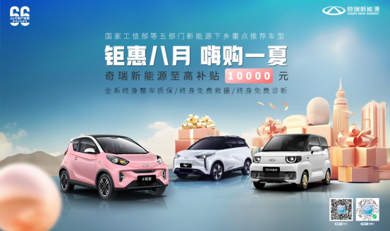 作为全球精品纯电小车引领者,奇瑞新能源深耕该领域多年,全球销量逾66万,凭借硬核产品力,树立同级价值标杆、智能标杆、安全标杆、服务标杆,赢得世界各国消费者的认可。未来,奇瑞新能源会继续以卓越的产品质量及服务呵护用户的出行旅程。此次八月钜惠,奇瑞新能源为有购车意向的用户带来了一笔超值福利,想买车的朋友们抓紧来“剁手”吧!