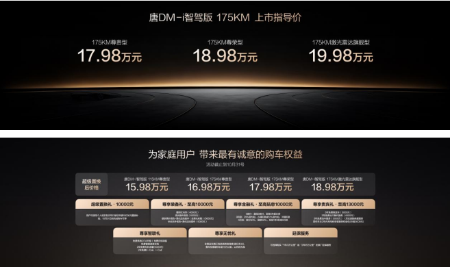 此次,唐DM-i智驾版 175KM长续航版共推出3款车型,售价17.98万~19.98万元(10月31日前完成购车可享10000元置换补贴)。