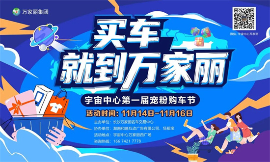 买车,就到万家丽!11 月 14 日 - 11 月 16 日,“宇宙中心第一届宠粉购车节” 将在宇宙中心万家丽西广场盛大开启。本次活动以名车试驾、全民红包雨、湘超热血观赛、锦鲤豪华大奖四大核心亮点,为长沙市民打造 “购车 + 狂欢” 的双重体验,无论是有刚需购车需求的消费者,还是想周末休闲逛展的市民,都能在此收获满满惊喜!这个周末别犹豫,直接锁定宇宙中心万家丽,购车狂欢就等你!