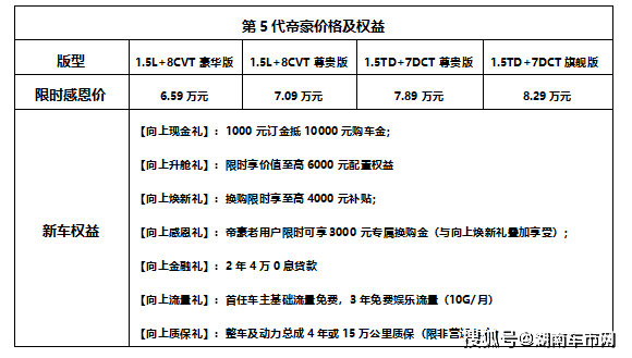 此次长沙国际车展上市的第 5 代帝豪,共推出 1.5L 与 1.5TD 两大动力序列四款配置车型,限时感恩价区间 6.59-8.29 万元。